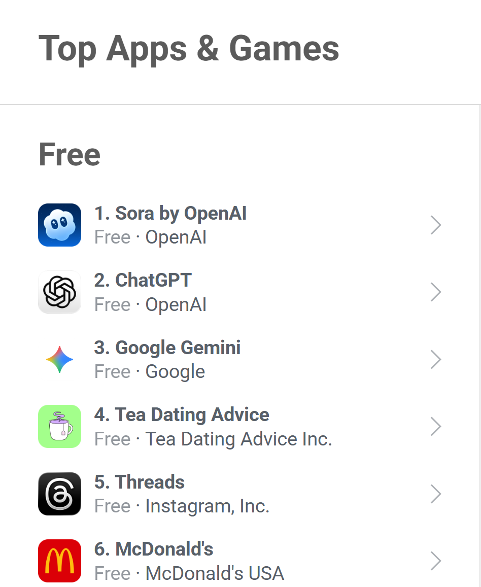但10月4日仍录得9.85万次日安拆量,ChatGPT首周仅正在美国地域上线,从数据对比来看,此后虽略有回落,敏捷跻身美国App Store“全体使用榜”第3名;更值得关心的是,首周正在iOS平载量达约62.7万次,Sora上线后用户增加连结不变。使用谍报供给商Appfigures近日发布最新数据显示,这一首颁发现不只超越Anthropic的Claude、微软的Copilot等支流AI使用初期程度,Appfigures数据显示,展示出强劲的市场吸引力。
