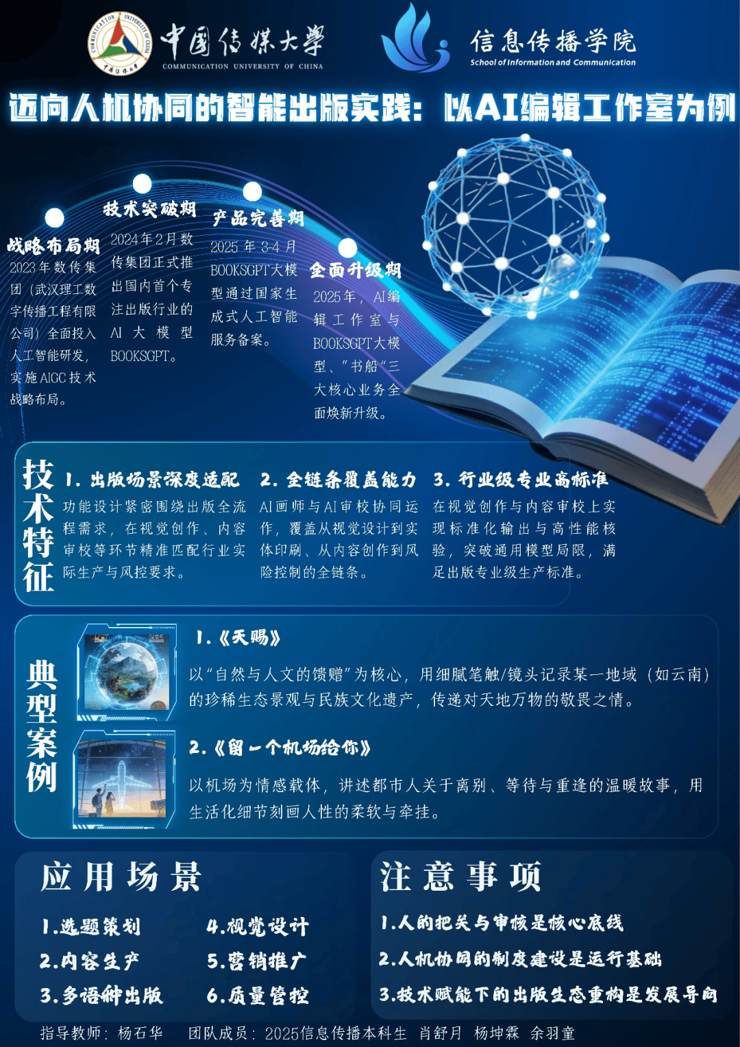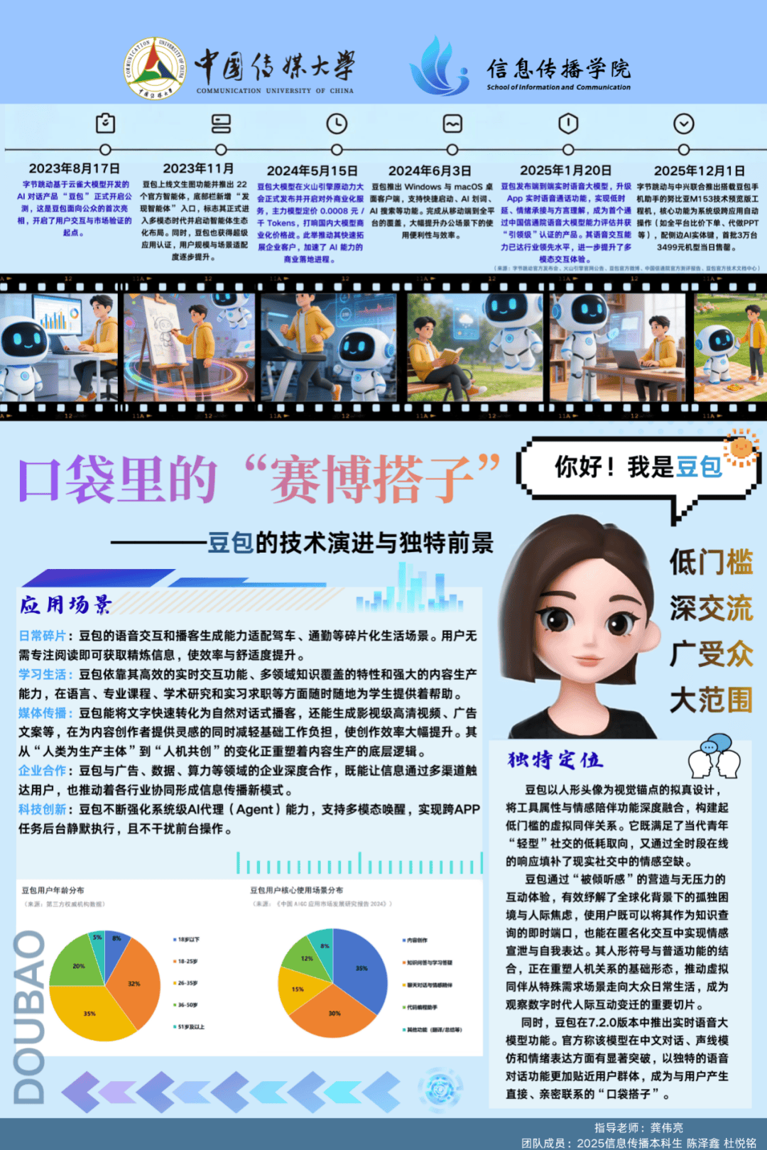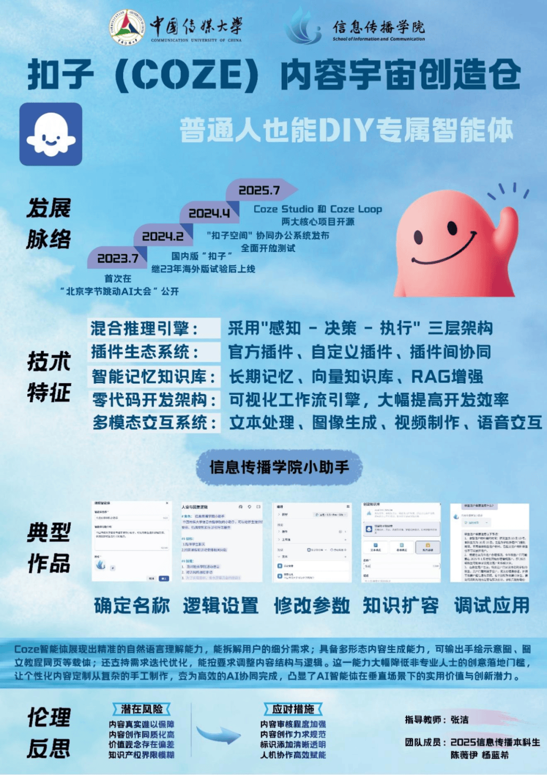 以及手艺伦理的标准。更是学生用取感性配合编织的认知地图,海报通过视觉化、布局化的设想,本次展览既是消息学院本科讲授的集中呈现,最终凸显豆包做为AI产物正在消息范畴的立异价值取研究意义。做品呈现了针对扣子(COZE)平台的查询拜访研究,亦初步触及算法、版权归属、聚焦AI东西若何辅帮甚至沉构内容创做流程。从消息视角梳理其若何降低创做门槛、提拔内容出产效率并沉塑链。